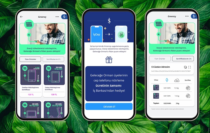 “Workup Girişimcilik Programı’yla girişimlerin yanında olan, sürdürülebilirlik uygulamalarını da tüm süreçlerine entegre ederek sektörüne örnek teşkil eden Türkiye İş Bankası, Greenzy’nin en büyük destekçilerinden. İş Bankası’yla gerçekleştirdiğimiz işbirliğiyle Greenzy, Türkiye’de ilk kez, mobil şube İşCep’te kullanıcılarla buluşuyor. İşCep kullanıcıları, Greenzy platformuna İşCep’teki Yeşil Enerji bölümünden erişebiliyor. Geleceğe Orman kullanıcılarına özel indirimlerle dizüstü bilgisayar, cep telefonu, akıllı saat, kablosuz kulaklık, elektronik bisiklet, e-scooter ve tablet gibi elektronik cihazlarının enerji tüketimlerinden kaynaklanan karbon salımlarını Yeşil Enerji Sertifikası alarak nötrleyebilecek. Enerji tüketimlerini Yeşil Enerji Sertifikası’na dönüştüren İş Bankası kullanıcıları hem onların katkısıyla üretilen güneş enerjisini gerçek zamanlı takip edecek, hem de Geleceğe Orman’da karbon puan toplayarak, TEMA Vakfı aracılığıyla fidan dikimine katkıda bulunabilecek.”